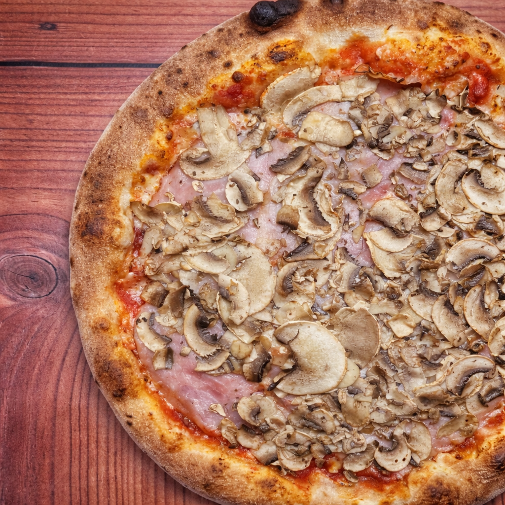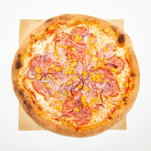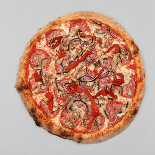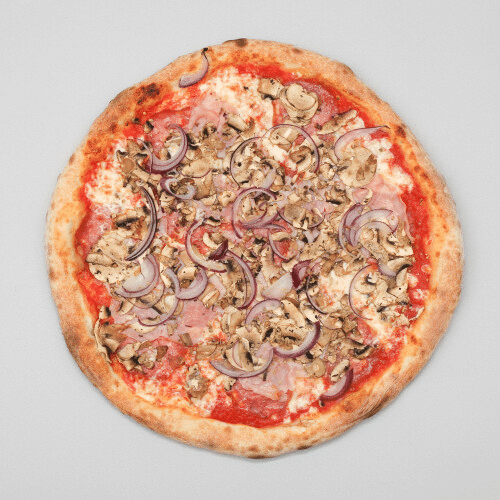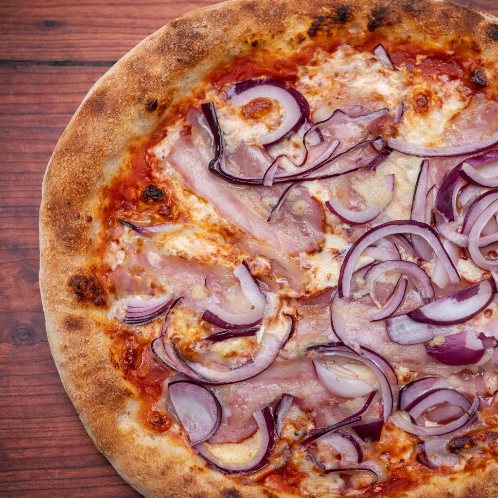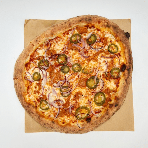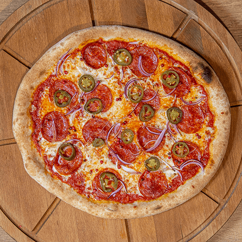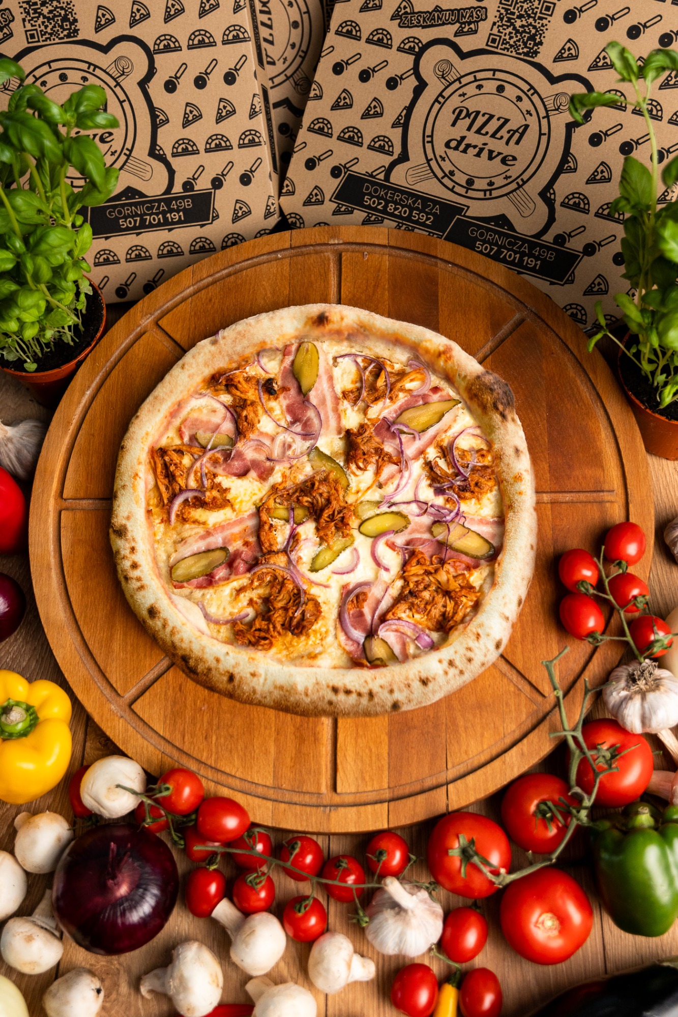 Sos pomidorowy , Mozzarella, Kurczak, Papryczki jalapeno, Cebula czerwona, Boczek