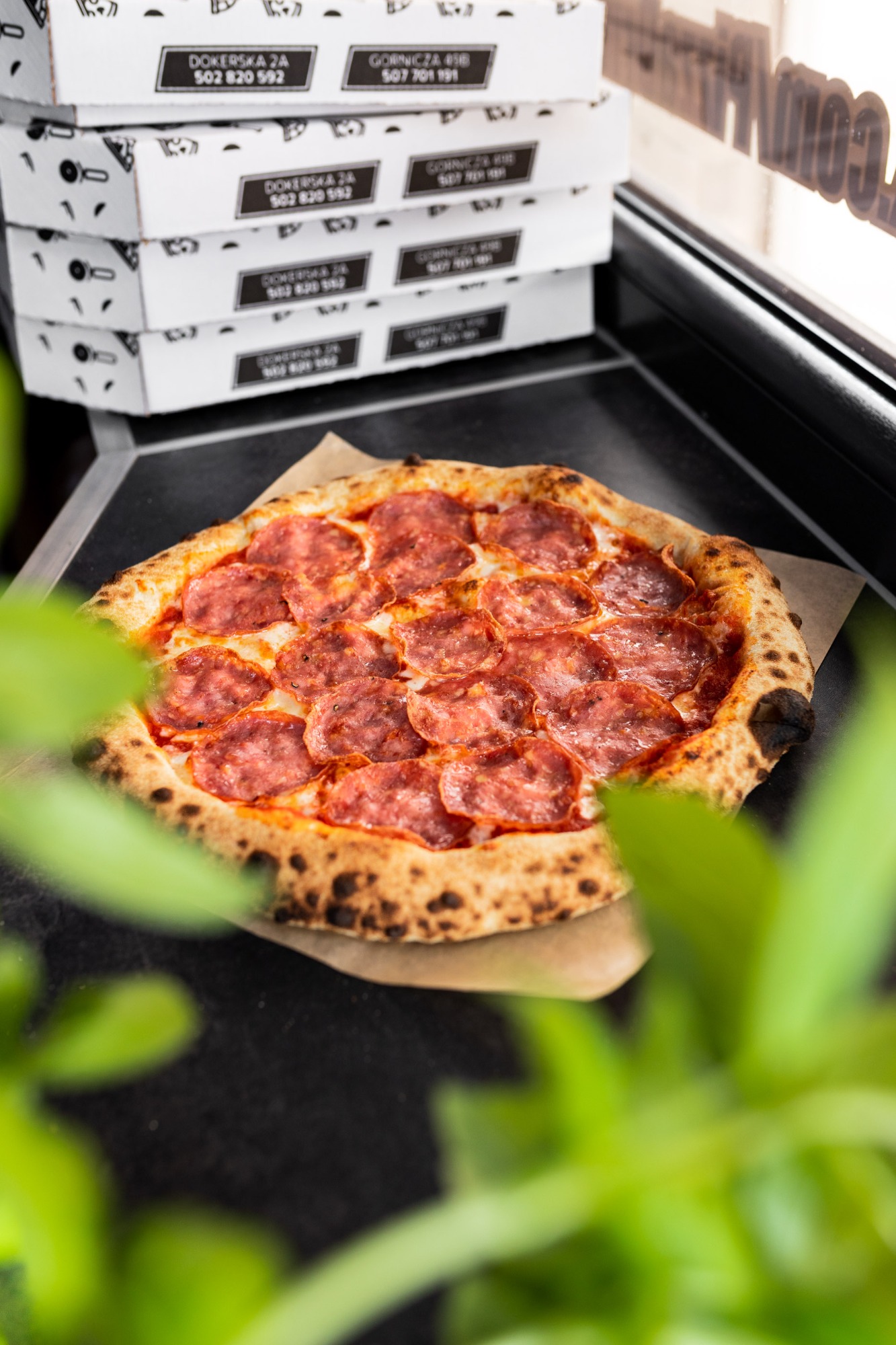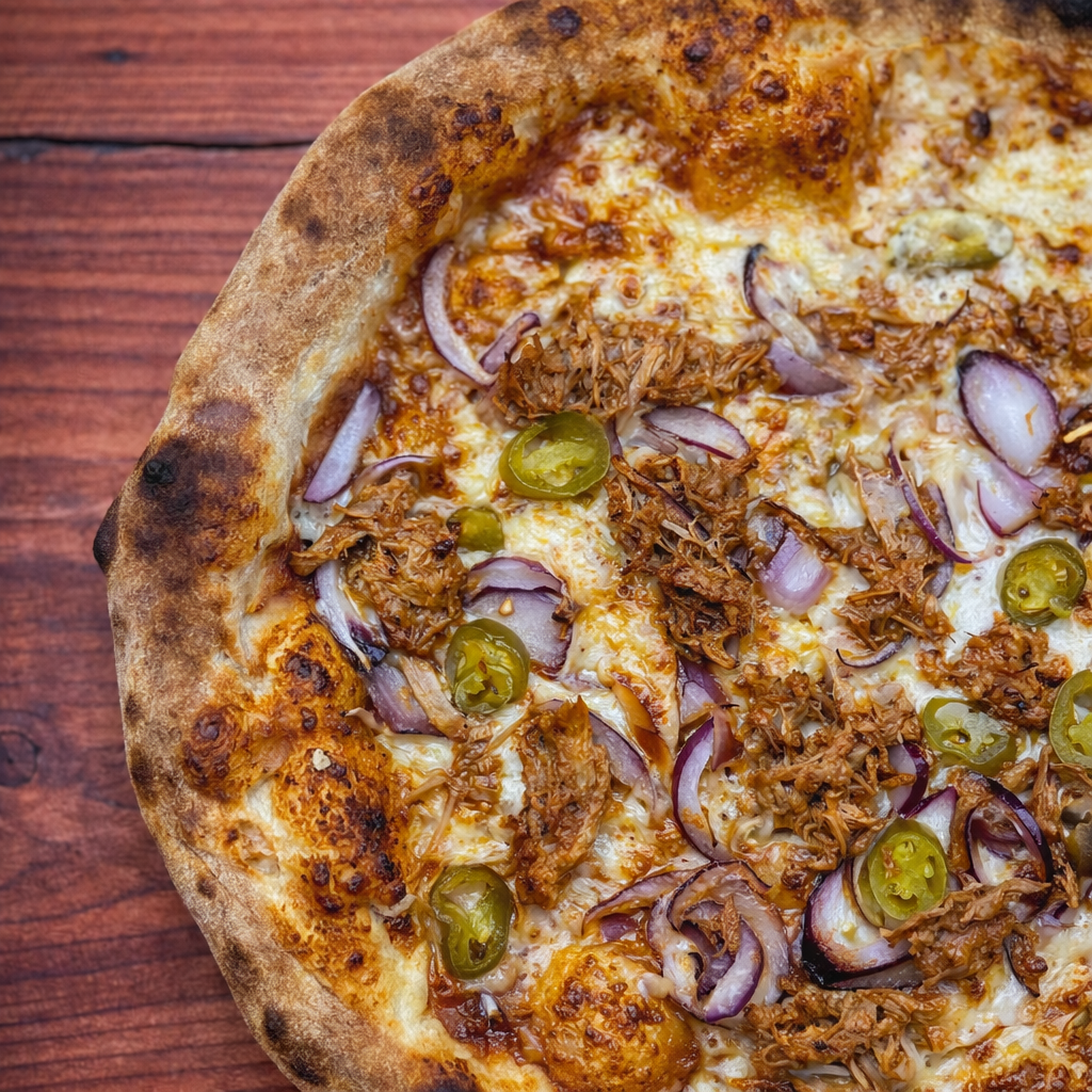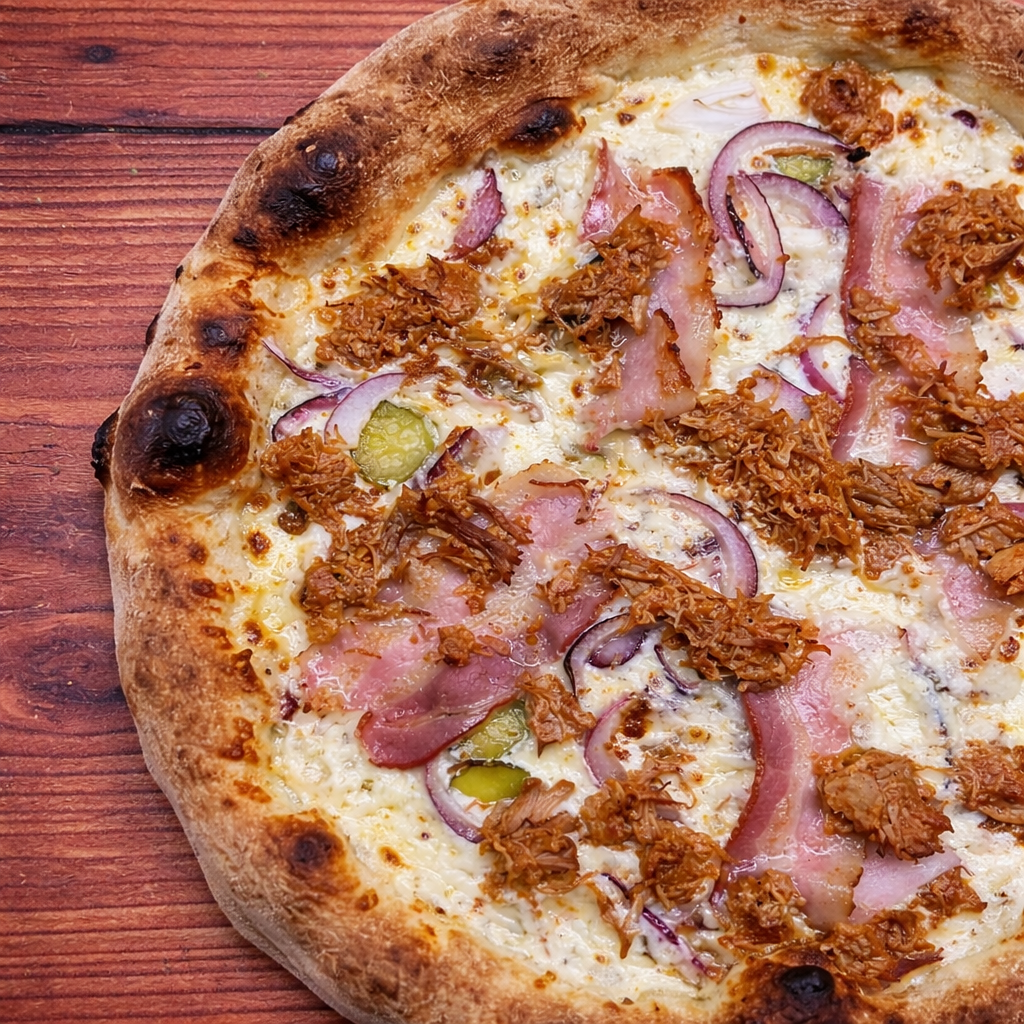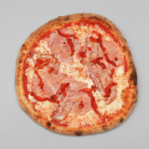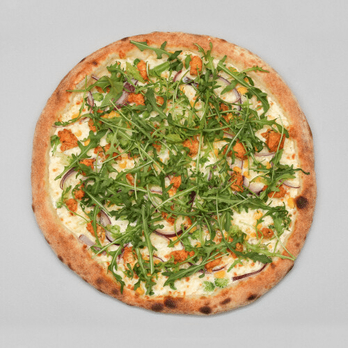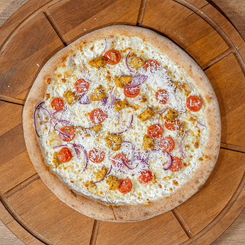 Sos pomidorowy , Mozzarella, Boczek, Kurczak, Papryczki jalapeno, Cebula czerwona